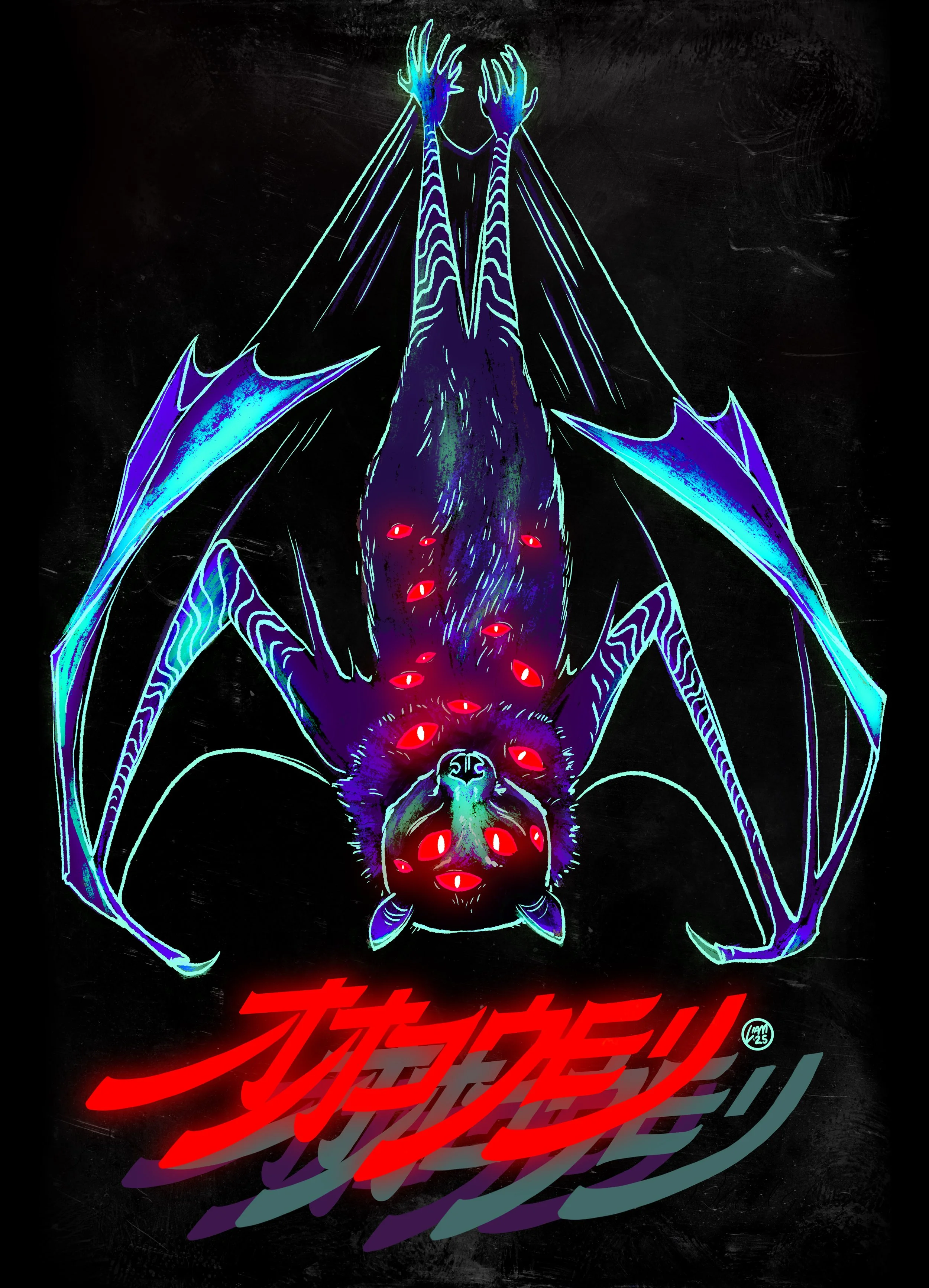 A recent illustration I made of a creature inspired by a flying fox “megabat” (as it says below in Japanese). Niteglow/Dayglow varients.